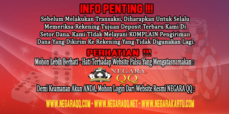 Negaraqq situs Agen Domino Online , Poker Online, Agen Poker Uang Asli , Domino Online Uang Asli. Dengan Deposit paling murah Hanya Rp 20.000,- Anda Bisa Menikmati Permainan agen Domino Online Uang Asli Yang Kami Berikan Khusus Untuk Anda Para Pecinta Taruhan agen domino indonesia. Nikmati Juga Bonus Referal Yang Kami Berikan Untuk Anda, Dengan Menebarkan Link Referal domino online uang asli Yang Terdapat Di Menu situs Poker Online. Referal Tentunya Sangat Bermanfaat Bagi Anda. Ayo Buruan daftar Sekarang Juga Hanya Di WWW.NEGARAQQ.COM